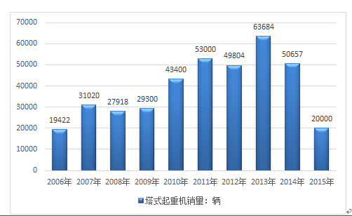 2014年我国塔式起重机销量为50657辆,2015年销量为20000辆,销量同比下滑60.8%。