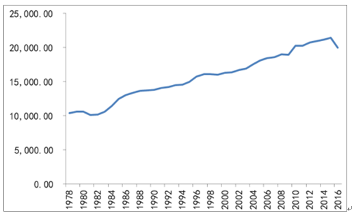 图表13:2014-2017年中国工业废水排放量规模趋势图