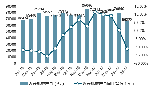 2016-2017年中国收获机械单月产量走势图