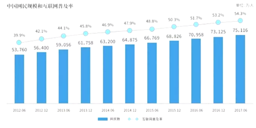 截至2017年6月,我国网民规模达到7.51亿,半年共计新增网民1992万人。互联网普及率为54.3%,较2016年底提升1.1个百分点。