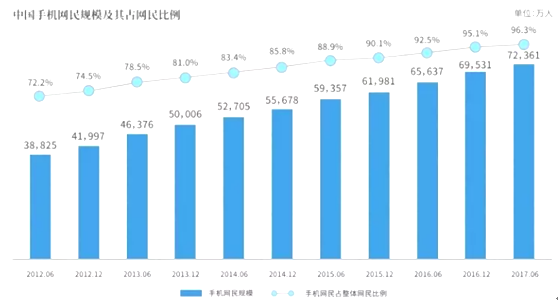 截至2017年6月,我国手机网民规模达7.24亿,较2016年底增加2830万人。网民使用手机上网的比例由2016年底的95.1%提升至96.3%。