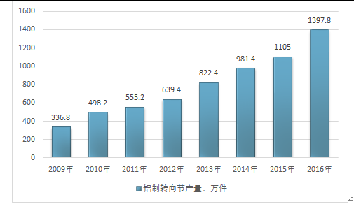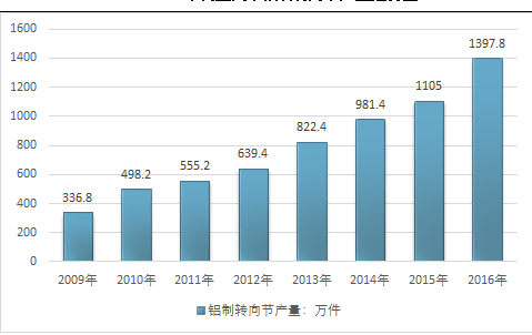 铝合金转向节是汽车的安保件,要求性能极,它具有减轻车身自重,节能降耗,减少尾气排放等突出特点。近年来随着国内汽车工业的稳步发展以及汽车轻量化技术的逐步普及,国内汽车铝制转向节产品产量呈稳步增长态势,2016年我国汽车铝制转向节产量达到1397.8万件。