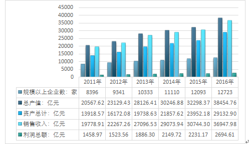 2016年我国汽车零配件及部件制造行业规模总资产达到29132.90亿元,行业销售收入为36947.98亿元,2016年行业利润总额为2694.61亿元。