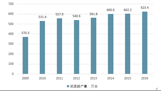 2014年中国减速机产量为600.6万台。2015年中国减速机产量为600.6万台。2016年我国减速机产量略微上升约523.4万台。