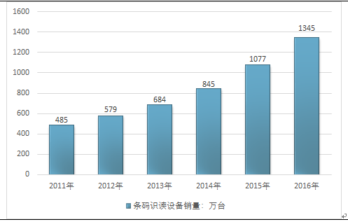 2016年我国条码识读设备市场需求量约1345万台,同比2015年的1077万台增长了24.9%,近几年我国条码识读设备市场需求量如下图所示: