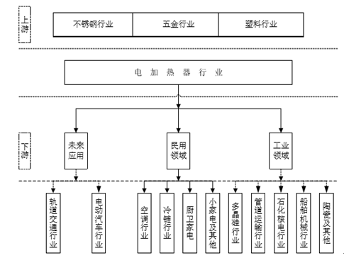 电加热器行业,上游主要是不锈钢、五金、塑料等行业,下游行业则十分广泛,包括家用电器、新能源、石油、天然气、化工、石化、冶金、医药、汽车,等等。