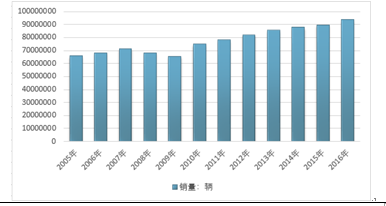 随着全球汽车工业的发展,汽车产业是世界上规模最大的产业之一,并成为美国、日本、德国等发达国家国民经济的支柱产业,对工业结构升级和相关产业发展有很强的带动作用。2010年汽车销量增长最快,达到14%,2016年受到全球经济低迷的影响,汽车销量仍保持低速增长,截止到2016年末,汽车销量同比增长4.7%。