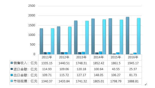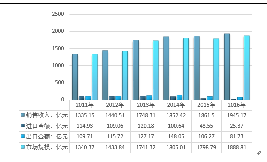 根据测算,2016年我国空气压缩机行业销售收入为1945.17亿元,进口总额为25.37亿元,出口总额为81.73亿元,行业市场规模为1888.81亿元。