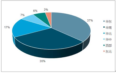 中国展示器材行业的供给市场和需求市场相对集中在华南和华东区域。其中,华东展示器材市场占比37.20%, 华南占比29.70%。华北占比16.90%,华中7.20%,西部5.8%,东北3.20%。