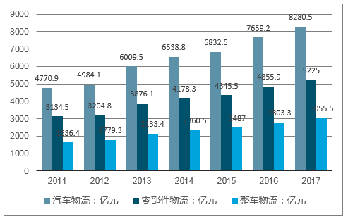 近年来,随着我国汽车产业蓬勃发展,汽车零部件行业迅速崛起,国内的汽车零部件物流也发展到了一个关键阶段。汽车零部件行业的迅猛发展,为我国汽车零部件物流市场带来了巨大的需求。一部汽车由一万多种零部件组装而成,在汽车工业的拉动下,我国汽车零部件物流市场需求呈增长趋势。我国汽车零部件物流市场规模从2011年的3134.5亿元增长至2017年的5225亿元。