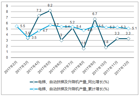 2017年1-12月全国电梯、自动扶梯及升降机产量增长走势