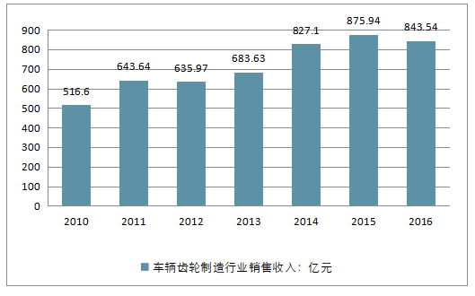 2010-2016年车辆齿轮行业销售收入总体呈现上升趋势变动,增速波动变化。2015年,中国车辆齿轮制造行业实现销售收入875.94亿元,同比增长5.90%,为近年来行业销售收入最高规模;2016年在行业整体的转型升级变动的影响下,当年销售收入小幅回落至843.54亿元,同比减少3.70%。