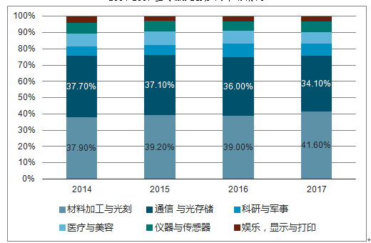 激光的应用领域十分广阔, 以激光器的下游领域划分,主要应用于材料加工与光刻、通信与光存储、科研与军事、医疗与美容、仪器与传感器、娱乐显示与打印领域。 其中, 根据统计, 材料加工相关的激光器收入2018年达51.66亿美元,占比41.6%,是激光器第.一大应用领域,通信与光学存储是激光器第二大应用领域, 2018年占比34.1%。