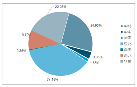从区域分布来看,东北地区占比最大份额,达到37.18%;其次是华北地区,占比为24.93%;随后是华东地区,占比达到22.25%。