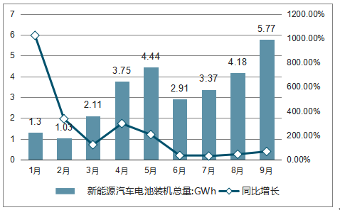 2018年1-9月新能源汽车电池装机总量及同比增长走势