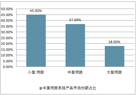 在伺服系统产品市场份额情况中,小型伺服占比为45%,中型伺服为37%,大型伺服为18%。