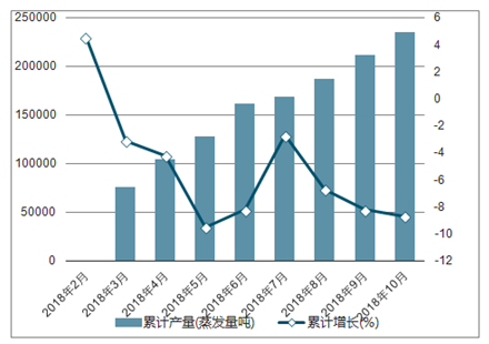 2018年2-10月中国工业锅炉各月累计产量及同比增长走势