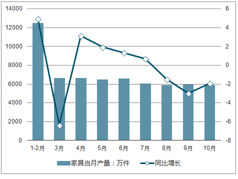 2018年1-10月全国家具当月产量及增长情况