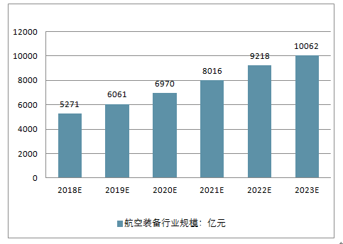 根据《中国制造2025》路线图,2020年,我国民用飞机营业收入将超过1000亿元;2025年,我国民用飞机营业收入将超过2000亿元;其复合增长速度超过14%。保守估计,2018-2023年,我国航空装备产业规模复合增长速度为15%。2018年,预计我国航空装备产业营业收入超5000亿元;到2023年,我国航空装备产业营业收入有望达到万亿元。