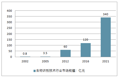 中国生物特征识别市场规模保持高速增长,近几年中国将在信息技术、信息安全、金融交易、社会安全等领域推动生物特征识别标准化工作,产业潜力巨大。2002至2015年,国内生物识别市场的年复合增长率达到50%,2016年生物识别市场规模达到120亿元左右。预计到2021年,中国生物识别行业的市场规模将突破340亿元。