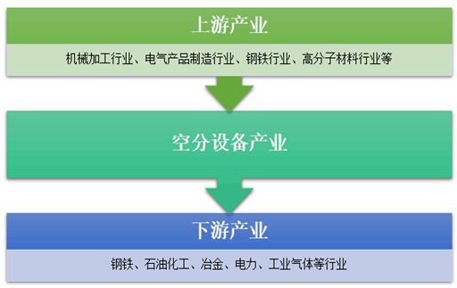空气分离设备生产所使用的主要原材料为铝材及钢材等金属材料,除此之外上游行业还包括机械加工行业、高分子材料行业等;空气分离设备广泛应用于传统的冶金、新型煤化工、大型氮肥、专业气体供应等领域。作为上述行业工业装置的重要配套设备,空气分离设备在需求量快速增长的同时,呈现出快速的大型化趋势。