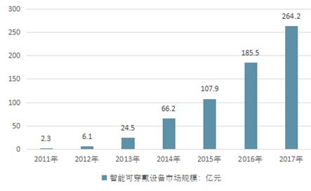 可穿戴设备市场的迅速升温吸引了众多企业厂商以及消费者,但是就目前来看,市场还处于初期阶段,正待领导者的出现。2018年我国可穿戴设备市场规模达264.2亿元。