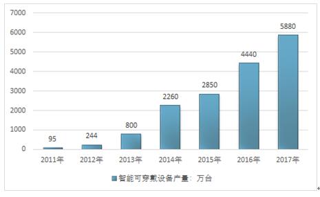 2018年我国智能可穿戴设备行业产量约5880万台,同比2016年的4440万台增长了32.43%,近几年我国智能可穿戴设备行业产量如下图所示: