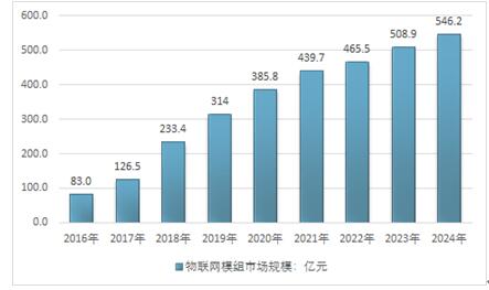 2016年我国物联网模组市场规模为83.0亿元,2018年我国物联网模组需求市场规模增长至126.5亿元,预计到2024年我国物联网模组市场规模将达到546.2亿元。