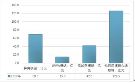 2018年我国物联网模组需求市场规模为126.5亿元,其中蜂窝模组需求市场规模为69.5亿元,LPWA模组需求市场规模为15.0亿元,局域网模组需求市场规模为126.5亿元。