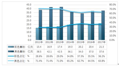 2011-2018年我国彩色墨粉市场规模及占墨粉产业比重分析
