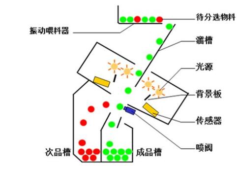 光电系统是色选机的关键部分,主要由光源、背景板、传感器和其他辅助装置组成,光源照到被测物料会产生不同的反光特性,背景板则提供基准信号,其反光特性与合格品等效,而与瑕疵品差异较大,之后光信号通过传感器转化成电信号传达给电控系统;
