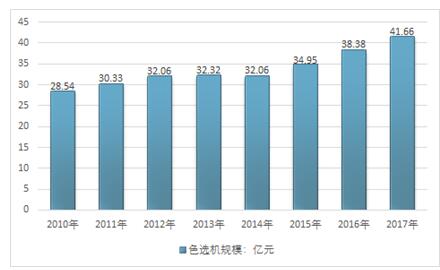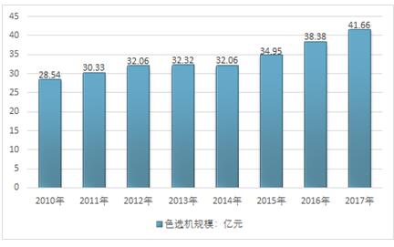 2018年我国色选机行业市场规模约41.66亿元,同比2016年的38.38亿元增长了8.55%。