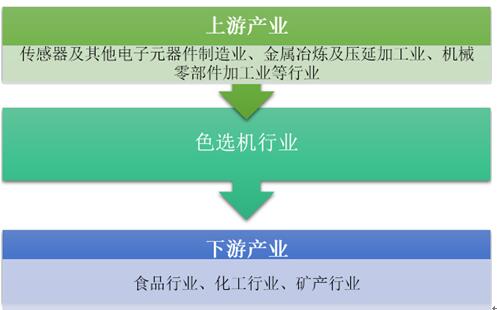 色选机的原材料主要有电子元件、金属材料、传感器等,产业链的上游主要是传感器及其他电子元器件制造业、金属冶炼及压延加工业、机械零部件加工业等行业,色选机普遍应用于很多领域,如食品行业对大米类、杂粮类(各种豆类)、茶叶类等进行色选分级,工业上一些化工行业(塑料片,塑料颗粒,食盐等)也能用到,近年来,色选机也应用到矿产行业中,进行矿石的筛选。