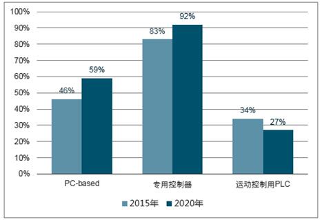 预计到2020年,PC-Based控制器、专用控制器、PLC用于运动控制的比重分别达到59%(+13%)、92%(+9%)、27%(-7%),PC-Based控制器用于运动控制的比例显著提升。