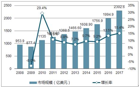 2014 年随着世界经济复 苏带动了整机出口的回暖,我国的模拟集成电路市场呈现平稳增长态势。2014年中 国模拟芯片市场销售额达 1608.9 亿元,实现同比增长 9.7%。2015年中国模拟芯片 市场销售额达1756.9 亿元,实现同比增长9.2%。2016 年中国模拟集成电路市场规 模达到 1994.9 亿元,实现同比增长 13.5%。2017 年中国模拟集成电路市场规模达到2302.6 亿元,实现同比增长15.4%。综合来看,最近三年我国模拟芯片市场发展呈现出稳定增长的态势,且明显超过全球模拟芯片市场的增速。