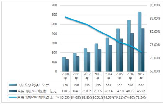 2011-2017年中国商用飞机MRO行业市场规模情况