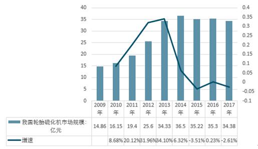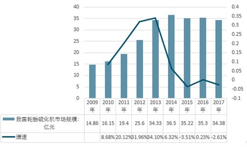 2009-2017年我国轮胎硫化机市场规模及增速走势图