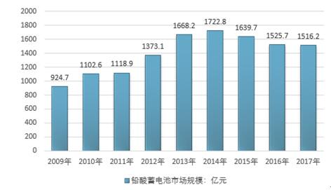 2017年我国铅酸电池行业销售市场规模约1516.2亿元,同比2016年的1525.7亿元下降了0.6%,近几年我国铅酸电池行业销售市场规模情况如下图所示: