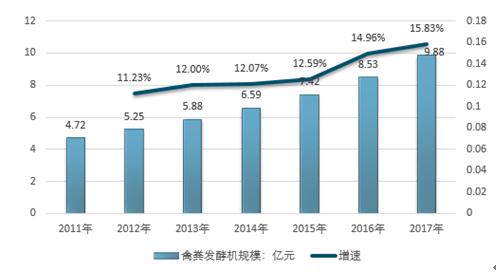 我国对禽粪发酵机设备需求旺盛,近年来市场稳定增长,2017年我国禽粪发酵机市场规模为9.88亿元,较2016年的8.53亿元增长15.83%。