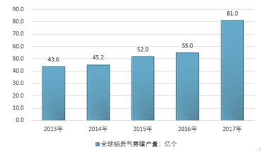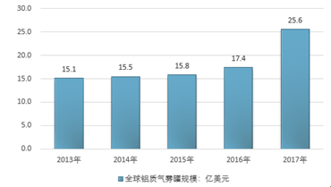 近年来,受益于全球个人护理用品及食品对铝质气雾罐的需求增加,全球铝质气雾罐的规模逐年攀升,2017年,全球铝质气雾罐规模达到了25.6亿美元。