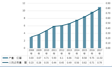 我国铝质气雾罐产量稳健增长,由2008年的3.03亿罐增长至2017年的11.02罐,人均占有由2008年的0.23罐增长至2017年的0.79罐。