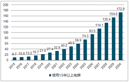 2015-2030年中国使用15年电梯保有量(万台)