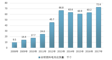 燃料电池不受卡诺循环的限制,所用的燃料为氢气、甲醇和烃类等富氢物质,环境友好。在全球范围内燃料电池具有广阔的应用前景。根据数据统计显示,从出货量数量统计来看,全球燃料电池出货量增长明显,2008年全球9.5千个,2012年增至4.57万个,到2017年全球燃料电池出货量达7.26万个。