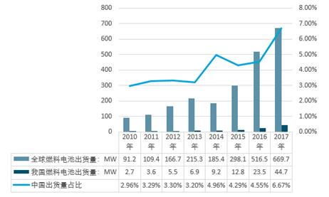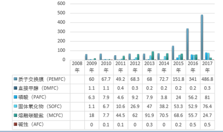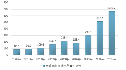 从出货容量统计看,2009年全球燃料电池出货容量为86.5MW,2016年增至516.5MW,2017年燃料电池出货容量达669.7MW。