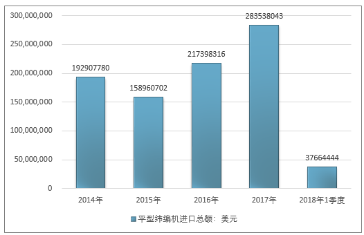 2016年我国平型纬编机进口总额217398316美元,2017年进口总额283538043美元;2019年1季度进口总额37664444美元。