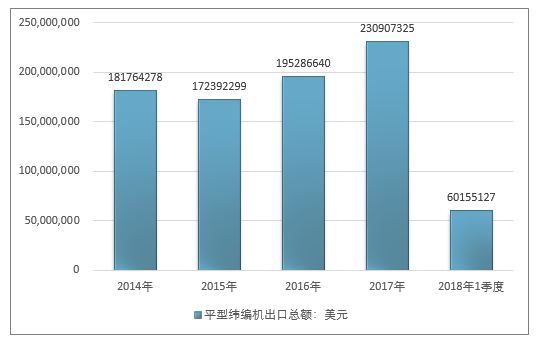 2016年我国平型纬编机出口总额195286640美元,2017年出口总额230907325美元;2019年1季度出口总额60155127美元。