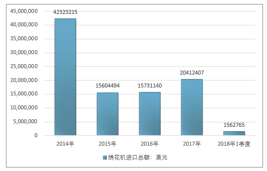 2016年我国绣花机进口总额15731140美元,2017年进口总额20412407美元;2019年1季度进口总额1562765美元。