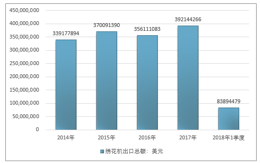2016年我国绣花机出口总额356111083美元,2017年出口总额392144266美元;2019年1季度出口总额83894479美元。