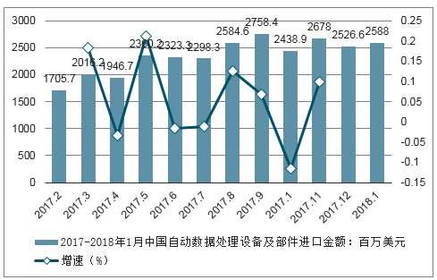 从中国自动数据处理设备及部件进口额来看,2019年1月中国自动数据处理设备及部件进口金额2588百万美元,同比增长29.4%。