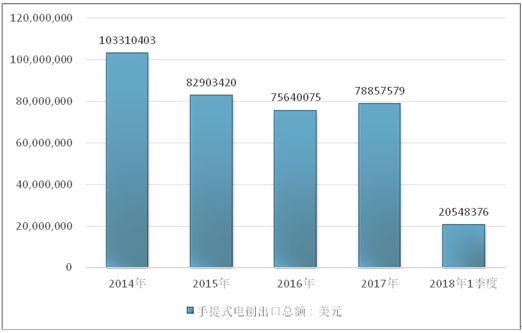 2016年我国手提式电刨出口总额75640075美元,2017年出口总额78857579美元;2019年1季度出口总额20548376美元。
